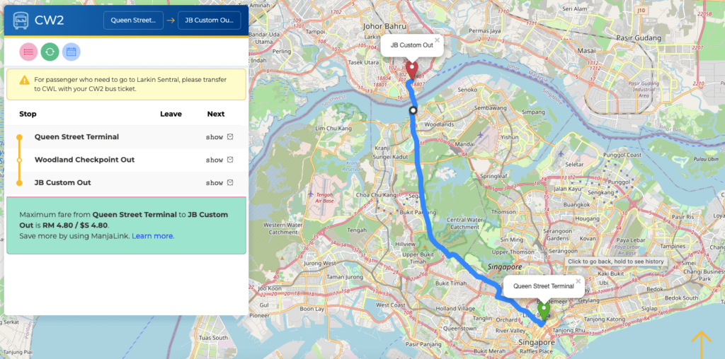 (Xem thêm thông tin xe tại: https://www.causewaylink.com.my/) - Lộ trình của tuyến CW2, bạn có thể xem tại link này: https://www.causewaylink.com.my/routes-schedules/singapore-cross-border-bus/?view=route&no=CW2