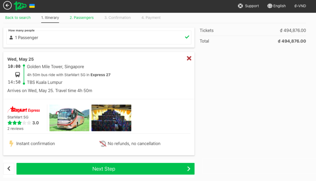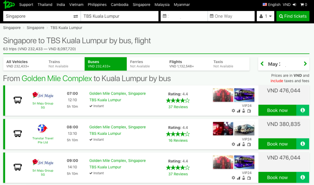- Để mua vé xe chạy thẳng Singapore – Kuala Lumpur bạn tiến hành đặt vé tại website: www.12go.asia