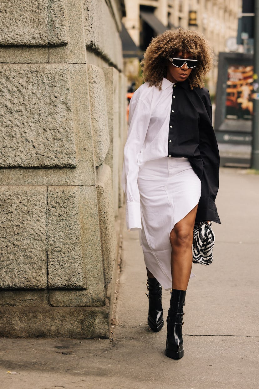Đây là một món đồ không thể thiếu trong tủ đồ dạo phố của các cô nàng. Với thiết kế dài đến đầu gối, chân váy midi mang đến cho chúng ta cảm giác thanh lịch và nữ tính. Bạn có thể kết hợp chân váy midi với áo blazer, áo cổ lọ,…để thỏa sức thể hiện cá tính của riêng mình. Cũng trong tuần lễ thời trang Milan 2023, ta bắt gặp hình ảnh rất nhiều quý cô diện chiếc váy midi thướt tha, đầy sức hút.