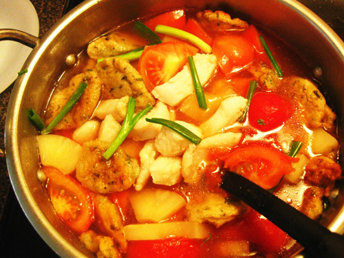 Bắt lên bếp 2 lít nước lọc, nấu cho sôi, sau đó cho phần cà chua, khóm và cá vào, nấu tiếp 5 – 10 phút cho cá chín thì nêm nếm với gia vị cho vừa ăn, sau đó tắt bếp.