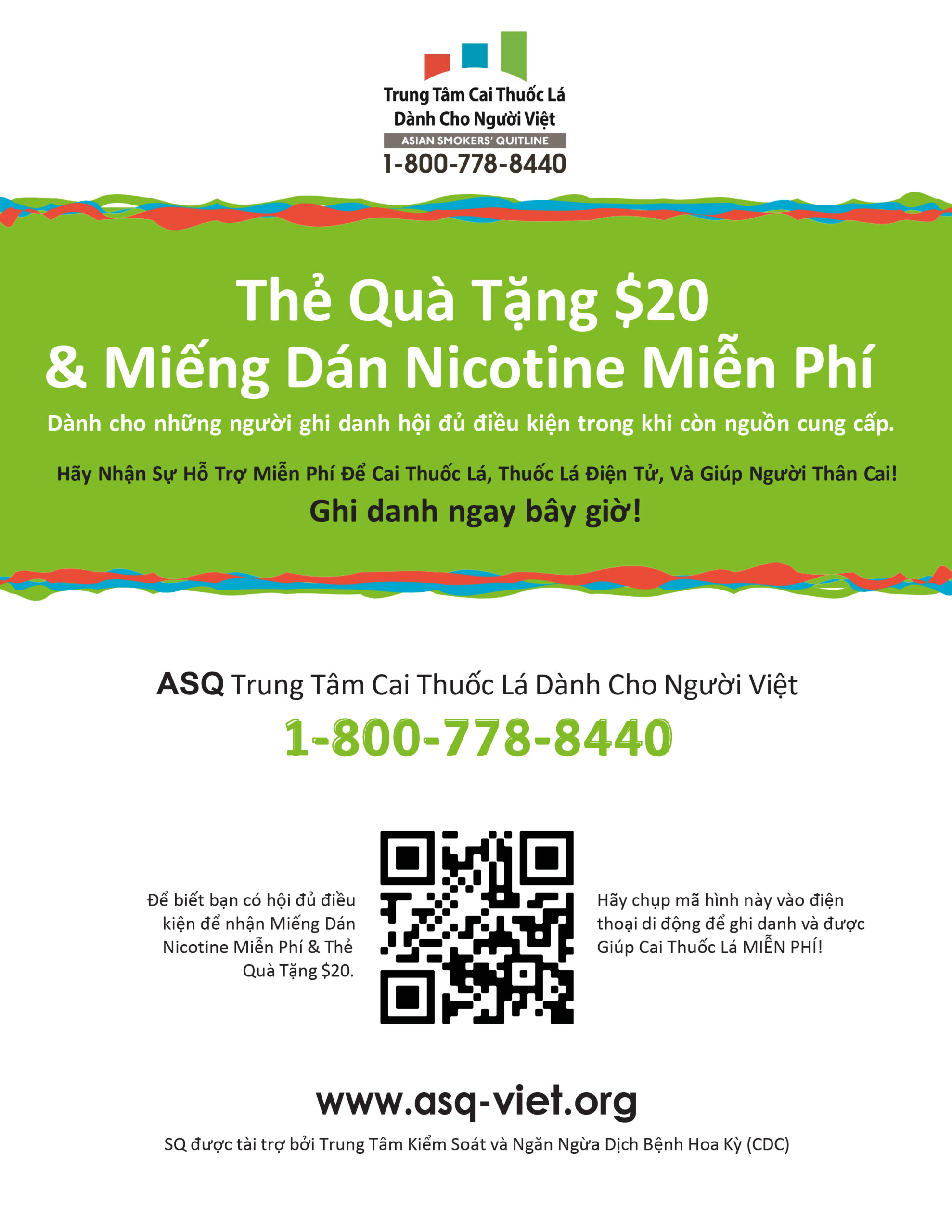 Thẻ quà tặng $20 chỉ có trong khoảng thời gian ngắn hoặc khi còn thẻ, mục đích là giúp tăng thêm động lực cho những người tham gia chương trình bắt đầu hành trình cai thuốc của họ. Bên cạnh việc cung cấp miếng dán nicotine miễn phí, ASQ Trung Tâm Cai Thuốc Lá Dành Cho Người Việt (1-800-778-8440) còn chú trọng đến việc hỗ trợ cho những người đang bước đến cuộc sống không khói thuốc được suôn sẻ hơn.