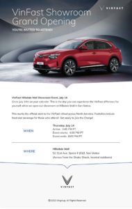 We’re thrilled to invite you to the grand opening of the VinFast Store at Hillsdale Shopping Center – 52 31st Avenue Space #J01B, San Mateo, CA 94403 at 4 PM on Thursday, July 14th. Please feel free to invite your friends or share the event.