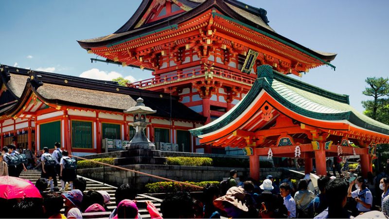Đền Fushimi-Inari còn đường người dân gọi với cái tên Đền ngàn cổng. Để vào được bên trong đền, bạn phải đi qua 10.000 cánh cổng Senbon Torii liên tiếp nhau. Đây chắc hẳn là một địa điểm check-in vô cùng độc lạ khi đến cố đô Kyoto.