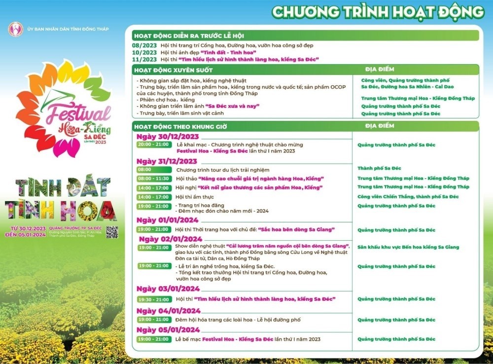 Festival Hoa-Kiểng Sa Đéc lần thứ 1 diễn ra với nhiều hoạt động văn hóa, du lịch ấn tượng, phong phú. Nhóm Chương trình chính có 09 hoạt động gồm: Hội thi trang trí Cổng hoa, Đường hoa, vườn hoa công sở đẹp; Không gian trải nghiệm hoa, kiểng; Trưng bày, triển lãm sản phẩm hoa kiểng trong nước và Quốc tế, sản phẩm OCOP của các huyện, thành phố trong tỉnh Đồng Tháp; Tôn vinh Người trồng hoa, kiểng Sa Đéc; Hội thảo Nâng cao chuỗi giá trị ngành hàng Hoa, Kiểng; Hội nghị kết nối giao thương các sản phẩm hoa, kiểng; Hội thi Thời trang hoa với chủ đề: “Sắc hoa bên dòng Sa Giang”; Lễ khai mạc – Chương trình nghệ thuật chào mừng và Lễ bế mạc Festival Hoa – Kiểng Sa Đéc.