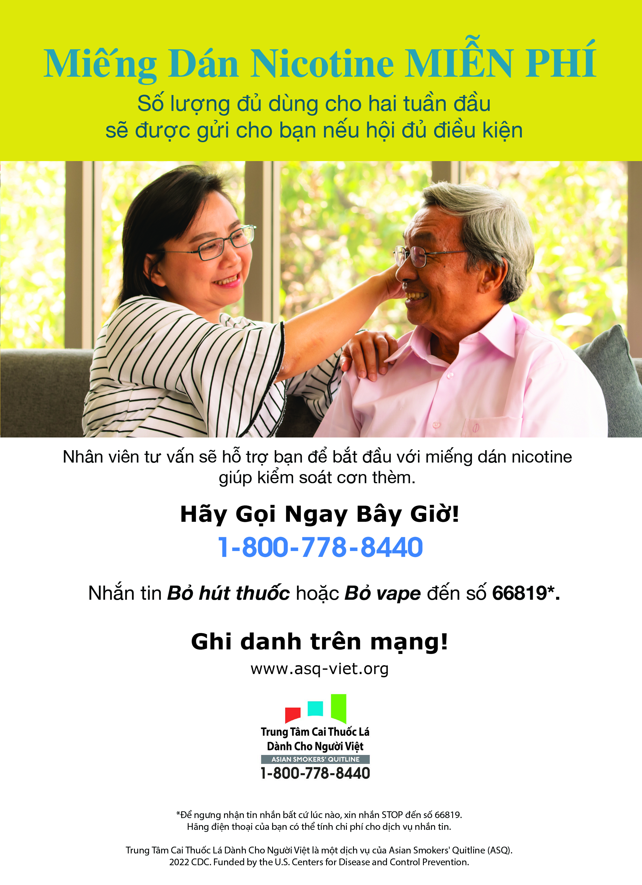 ASQ Trung Tâm Cai Thuốc Lá Dành Cho Người Việt là một dịch vụ của Asian Smokers’ Quitline (ASQ) và được tài trợ bởi Trung Tâm Kiểm Soát và Ngăn Ngừa Dịch Bệnh Hoa Kỳ (CDC) từ năm 2012. ASQ cung cấp các dịch vụ cai thuốc lá dựa trên nghiên cứu, hoàn toàn MIỄN PHÍ, bằng tiếng Quảng Đông, Quan Thoại, Đại Hàn và Việt Nam, cho hơn 21,000 người tại Hoa Kỳ. Những người hút thuốc hội đủ điều kiện có thể nhận được miếng dán nicotine miễn phí đủ dùng trong hai tuần. Nghiên cứu cho thấy những người hút thuốc mà ghi danh vào các dịch vụ của chương trình ASQ tăng cơ hội gấp đôi để cai thuốc lá thành công.