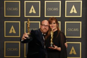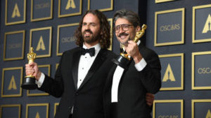 Leo Sanchez Barbosa and Alberto Mielgo accept the Animated Short Film Award for ‘The Windshield Wiper’