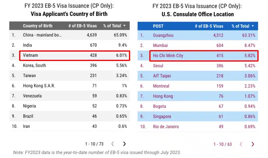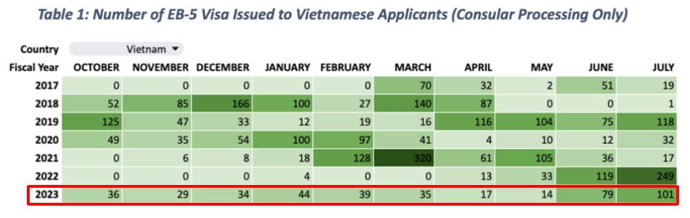 Tại Việt Nam, đã có đến 541 hồ sơ được cấp visa EB-5 từ tháng 10/2022 đến tháng 9/2023, chiếm 6% tổng số visa EB-5 được cấp trên toàn cầu trong năm tài chính 2023. Tại Văn phòng Lãnh sự quán tại Thành phố Hồ Chí Minh, con số ghi nhận đạt mức thấp nhất trong 3 năm. Ngoài ra, có đến hơn 1.500 người đang chờ xin tại Trung tâm Thị thực Quốc gia (NVC) vào đầu năm tài chính 2023 (chi tiết theo bảng bên dưới).