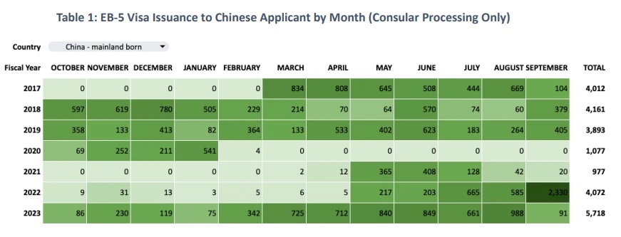 Trong năm tài chính 2023, Trung Quốc tiếp tục là nguồn đầu tư hàng đầu khi có đến hơn 5.700 visa EB-5 được cấp, chiếm 67% tổng số năm 2023. Ngoài ra trong năm nay, ngày đáo đối với Trung Quốc đã được đẩy lên 170 ngày. Tính riêng tại Quảng Châu, văn phòng Lãnh sự quán Mỹ tại đây đã xử lý 5.561 đơn xin, tăng 41% so với năm trước, đây là một con số đáng kể