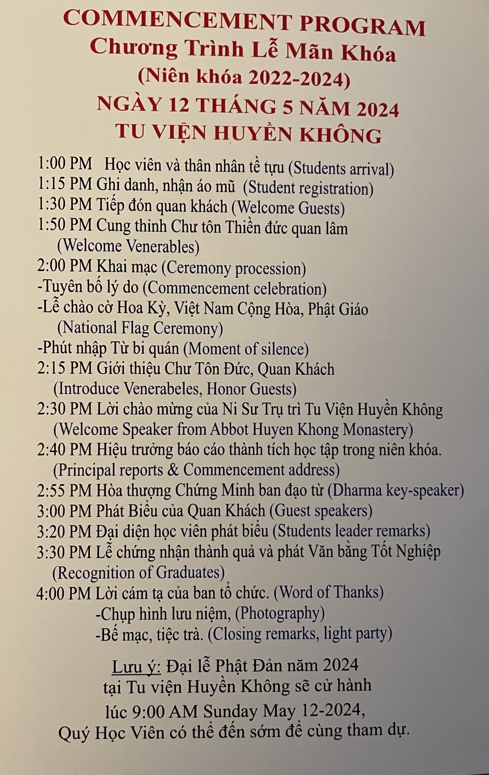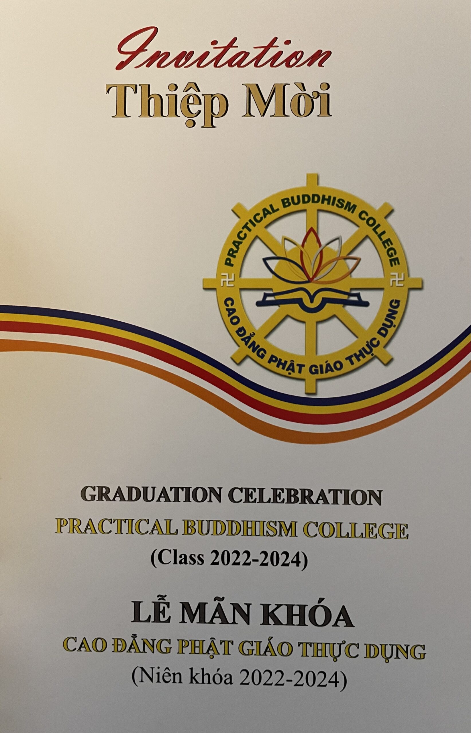 Tham dự Lễ Mãn Khoá Niên Học đầu tiên 2022-2024 Trường Cao Đẳng Phật Học Thực Dụng tại Tu Viện Huyền Không – Huyen Khong Monastery địa chỉ 14335 Story Road, San Jose, Ca 95127.
