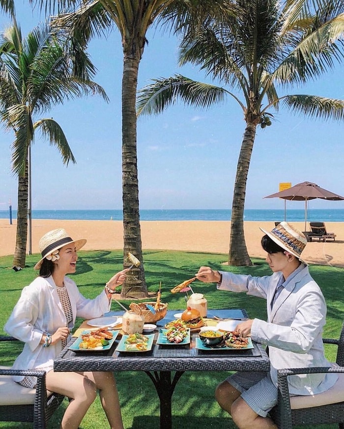 Bên cạnh đó, trong âm thanh du dương, rì rào của biển cả, bạn và người ấy có thể thưởng thức các món hải sản tươi sống được đánh bắt trong ngày hoặc lựa chọn các món ăn kiểu Việt Nam hay quốc tế tại nhà hàng My Oasis; hay cùng nửa kia đắm mình trong khu vực hồ bơi chính và quầy bar Blue Waves phía dưới chân đồi.